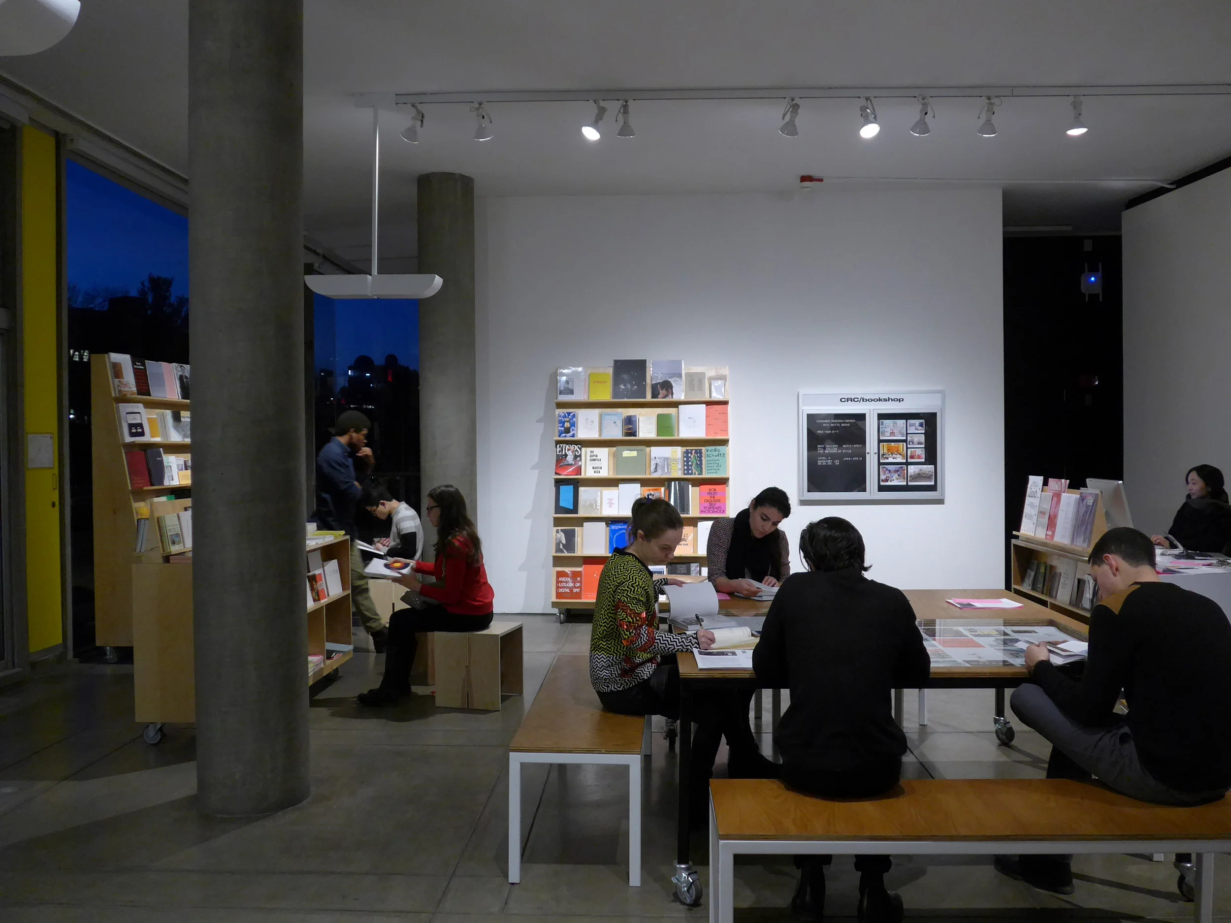 The Limit of a Function served as a means of assembly and display. It was a table and a vitrine made of powder-coated steel and plywood. It had two rectangular recessed areas covered by glass for exhibition of materials while functioning as a place for repose, study and discussion. The dimensions of the table were derived from Le Corbusier’s grid pattern incised in the concrete floor on Level 3 with a height slightly more than a typical table, slightly less than a vitrine. Two benches and several stools served as seating. The soft wood surfaces of the table and seating were stained comparable in color to the warm accent panels of the Carpenter Center. Casters on the table accommodated different arrangements to coordinate and support programmatic and exhibition activity in the space.